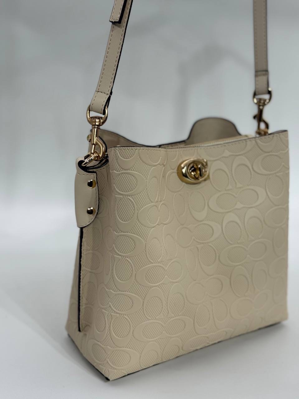 Coach Gofraj baskılı kilitli büzgülü bej çanta