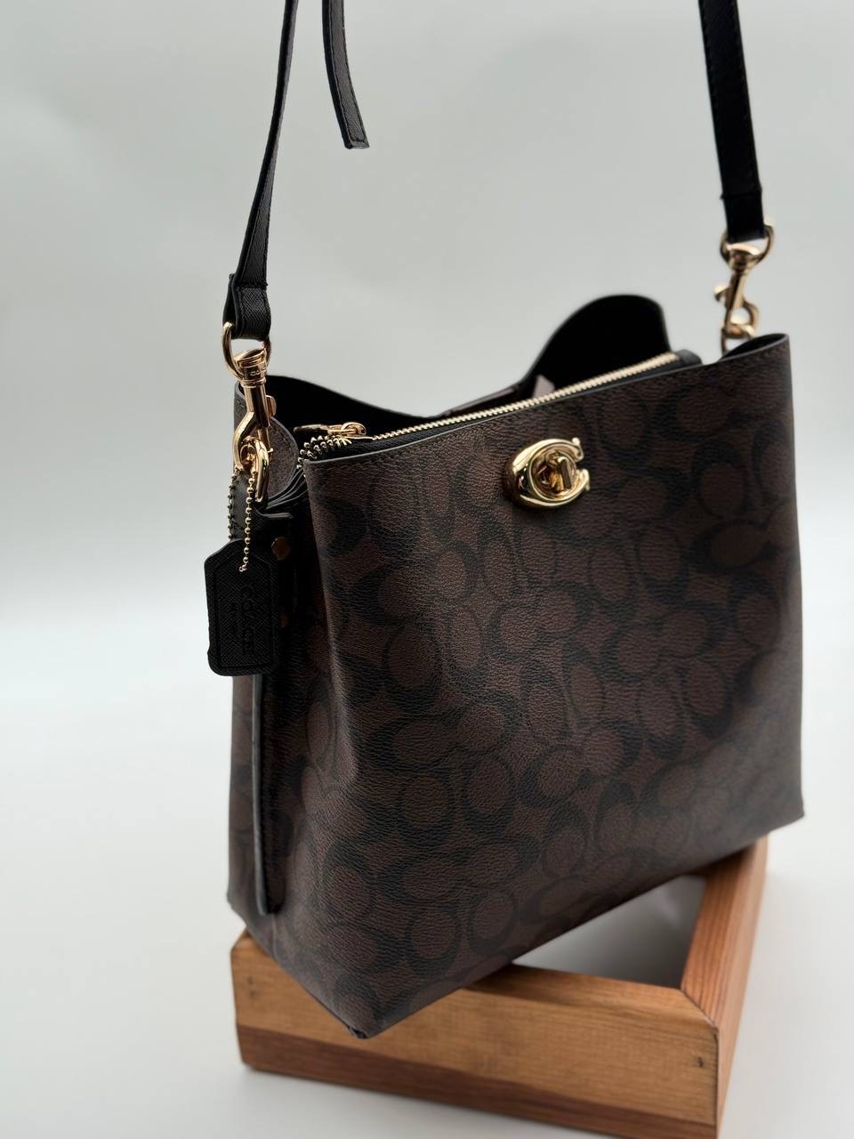 Coach Gofraj baskılı kilitli büzgülü kahve siyah çanta