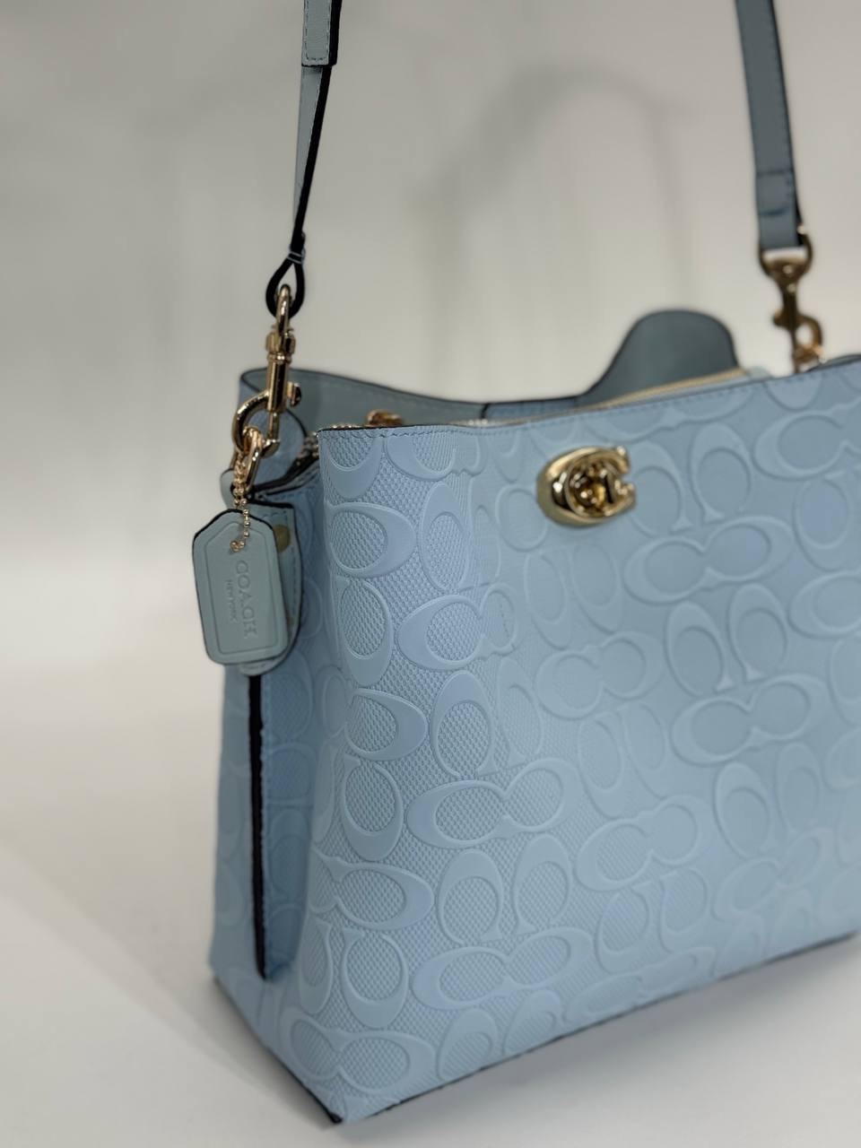 Coach Gofraj baskılı kilitli büzgülü mavi çanta