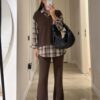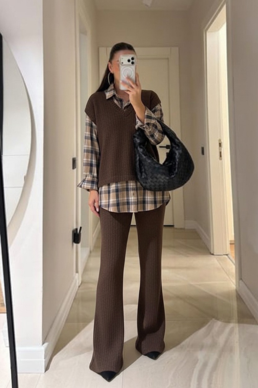 Gömlek Detaylı Triko Pantolon Takım-Kahve-Gri