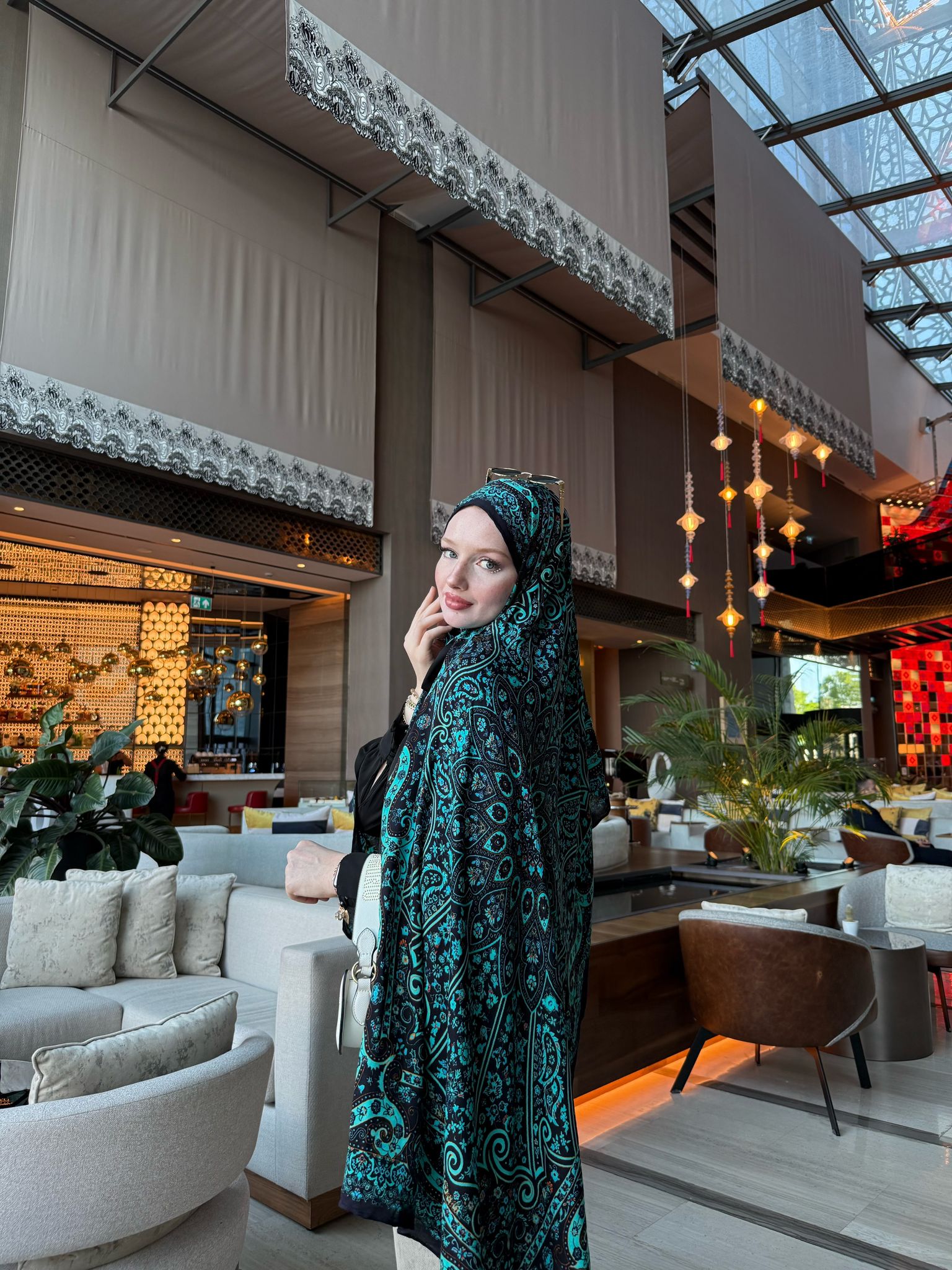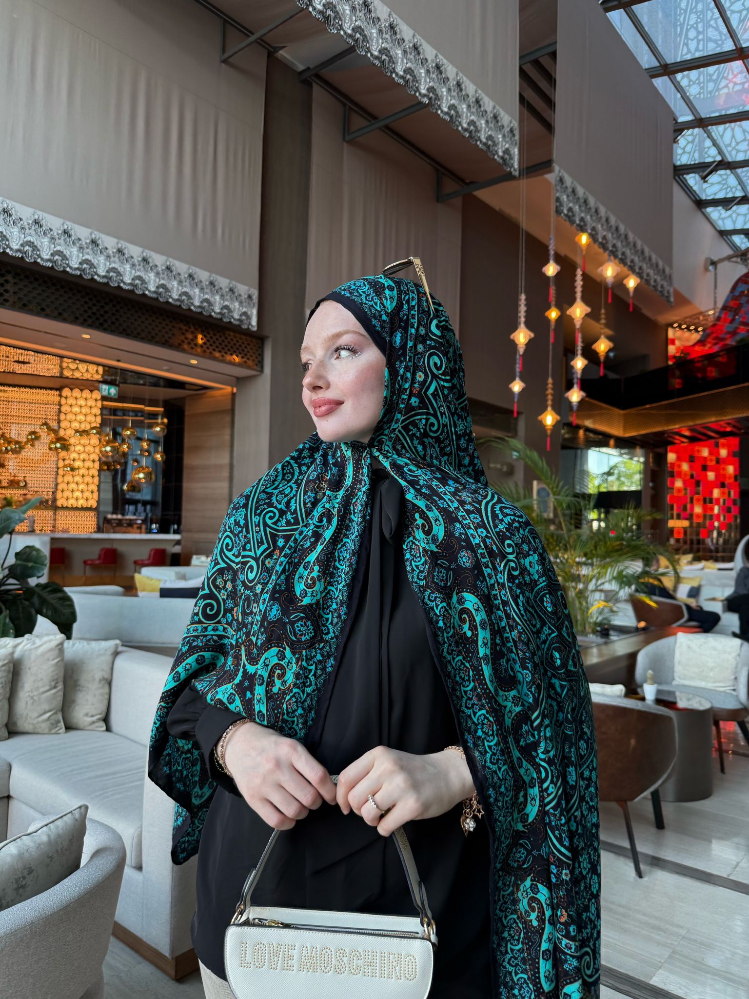 Deryanın seçimi Petrol Zambak Desenli Yün İpek Şal