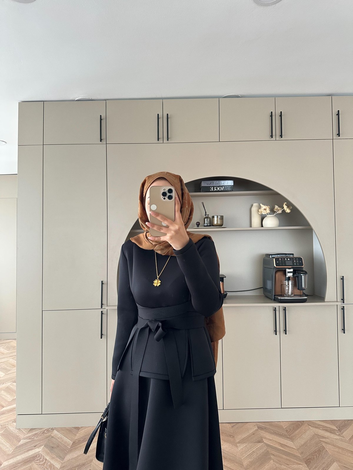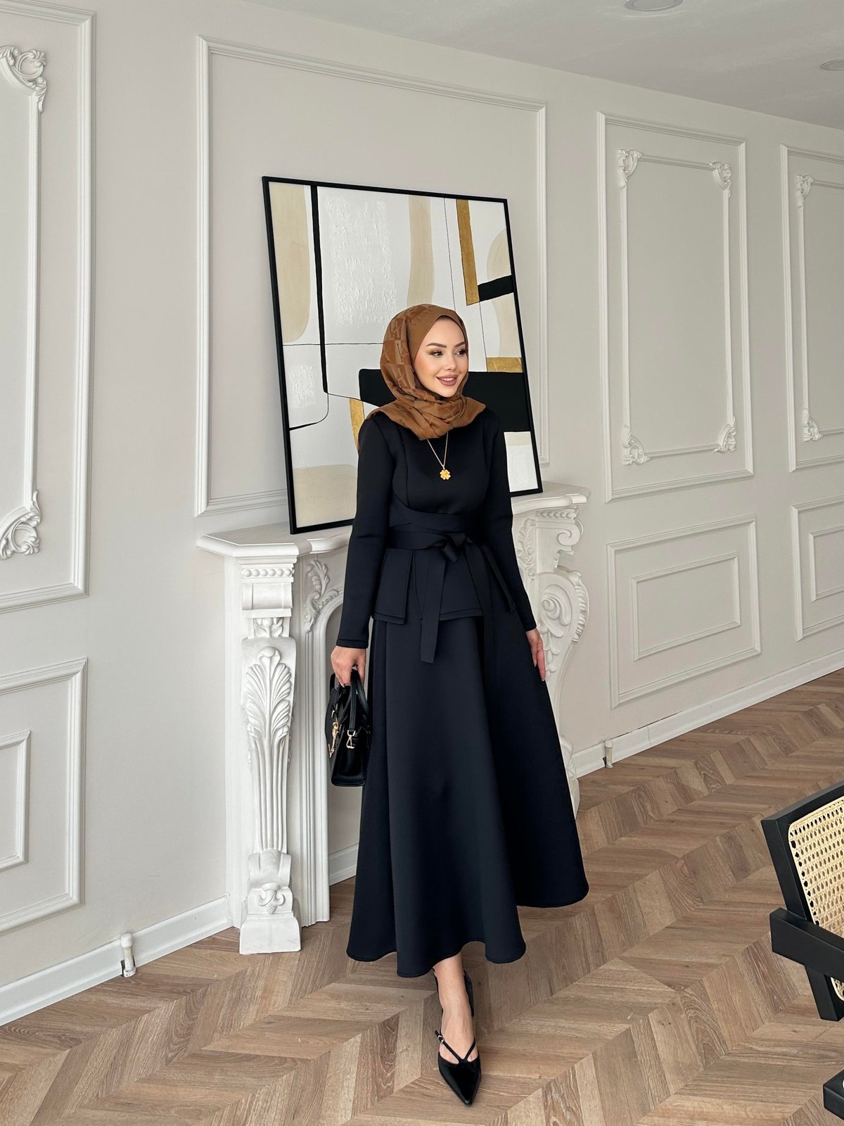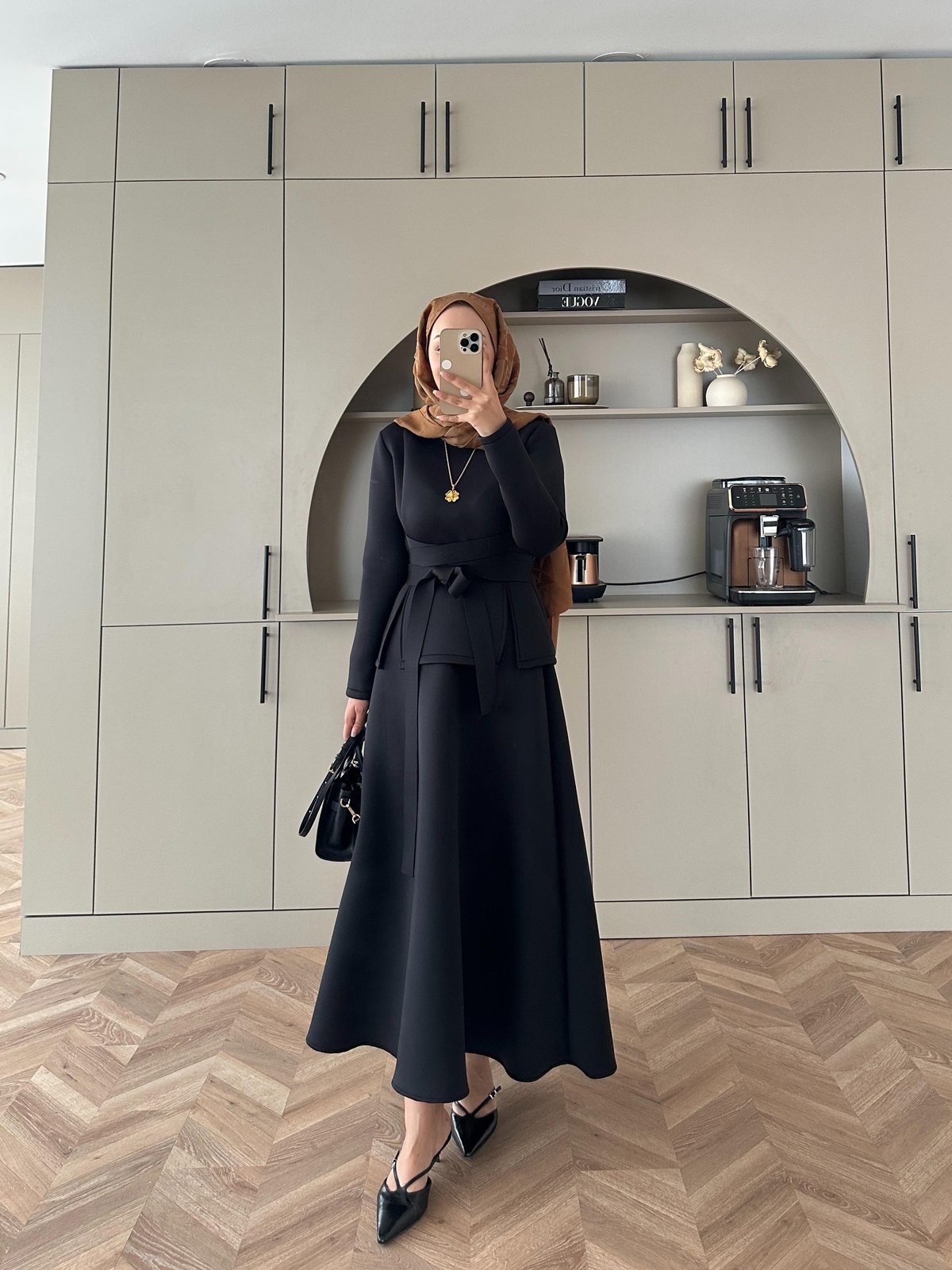 Siyahın asaletini modern bir dokunuşla birleştiren bu scuba etekli takım ile stilinizi konuşturun. Bel vurgulu ceket ve kloş etek kesimi sayesinde hem şık hem de rahat bir görünüm elde edin. Spor ayakkabı ile kombinleyerek havalı, dinamik bir tarz yakalayın!