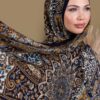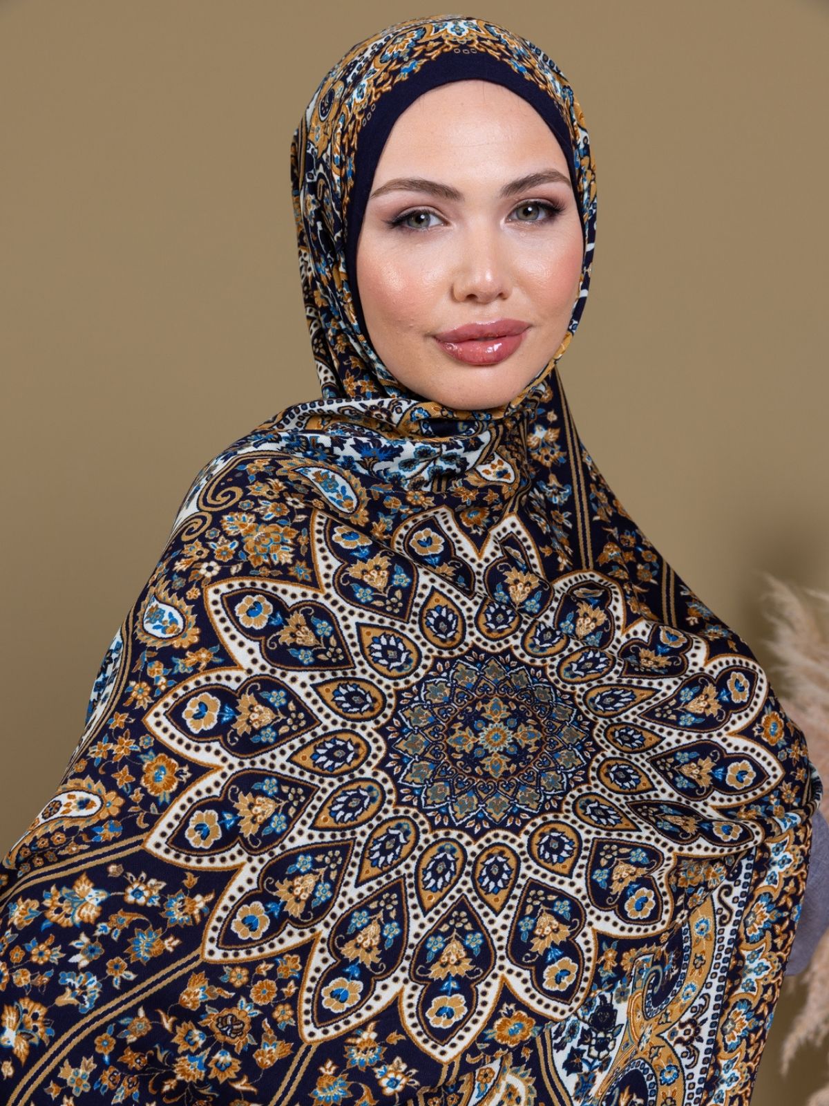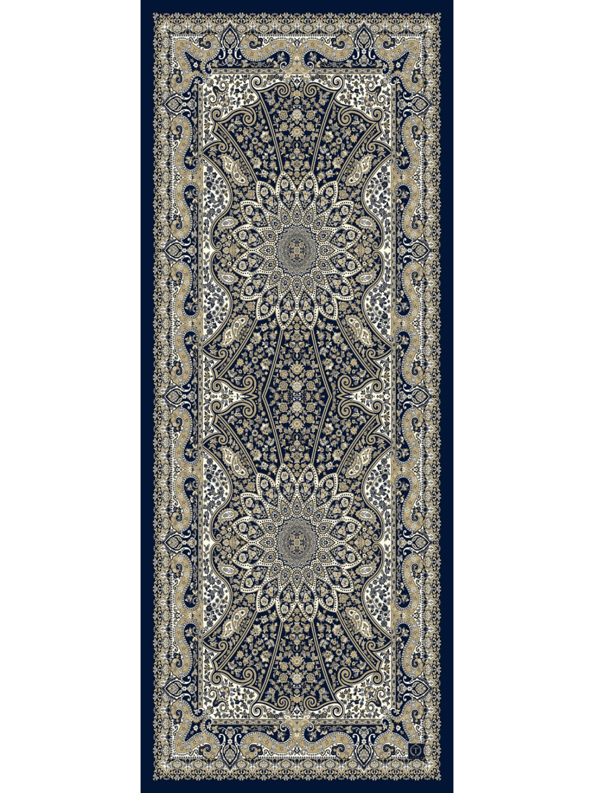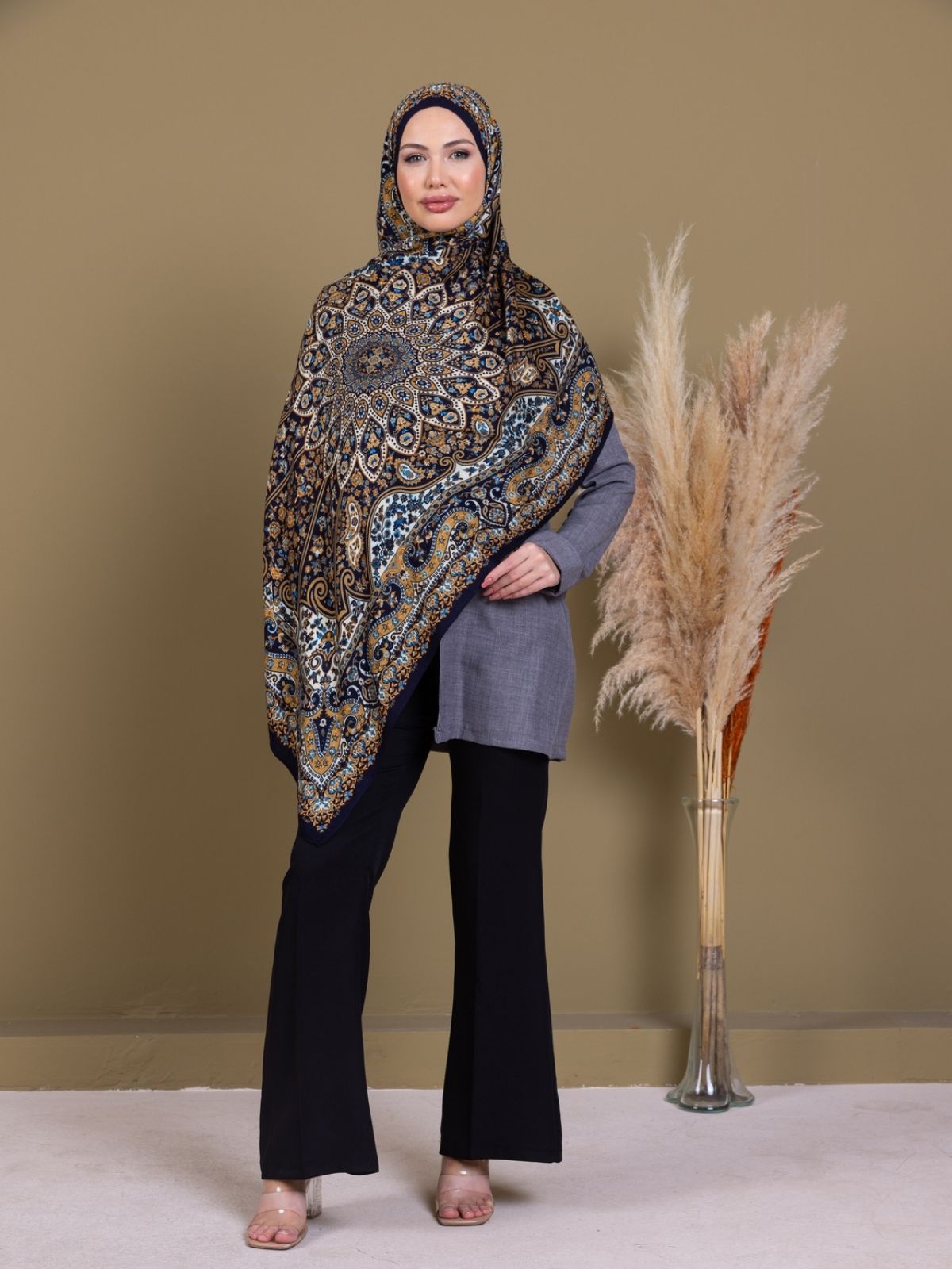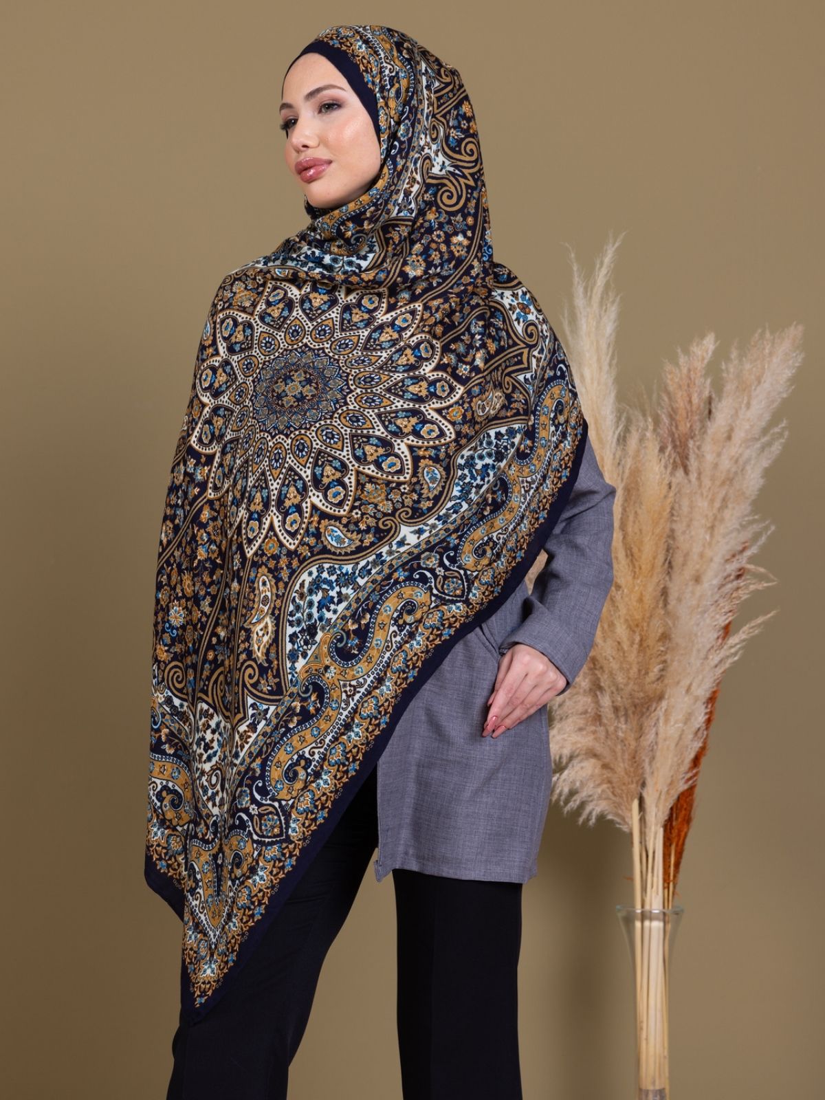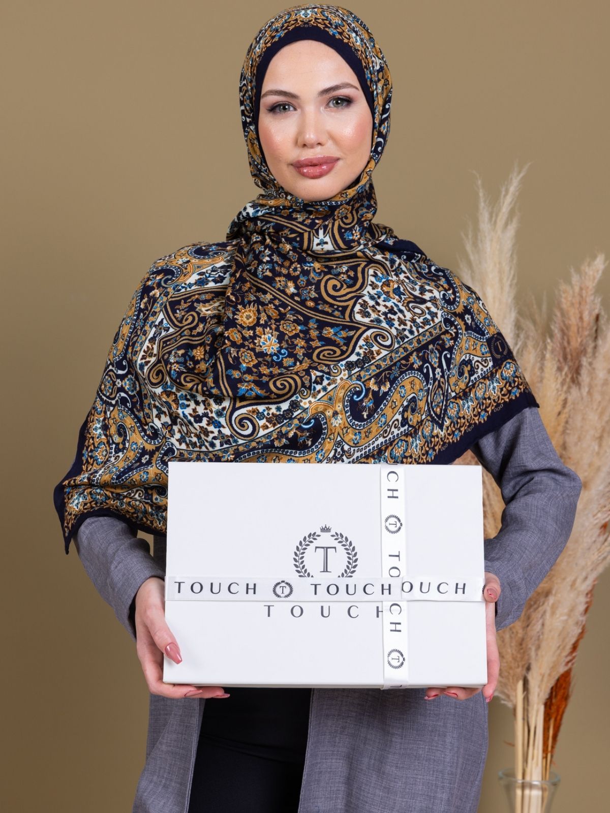 Gece Mavisi Zambak Desenli Yün İpek Şal – Touch İpek
