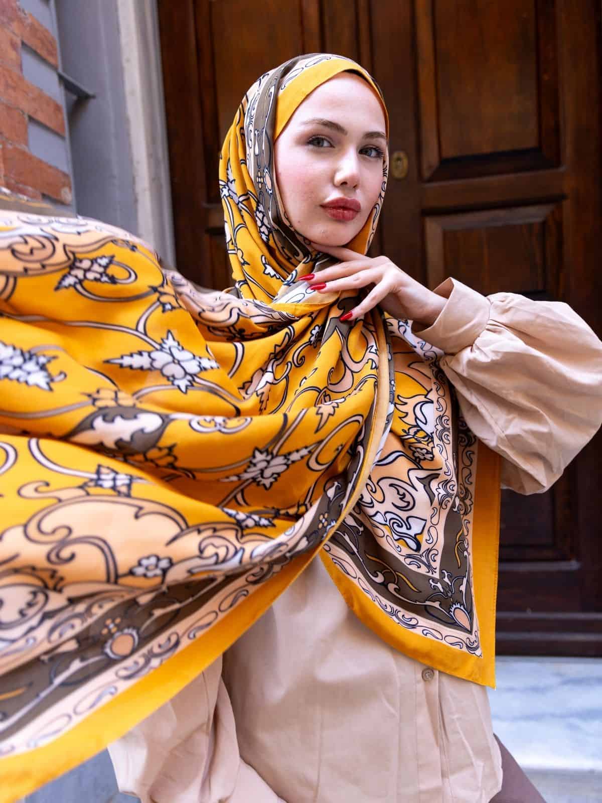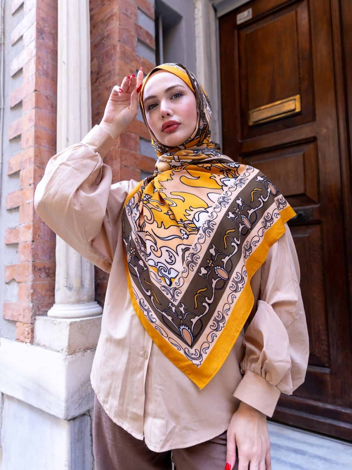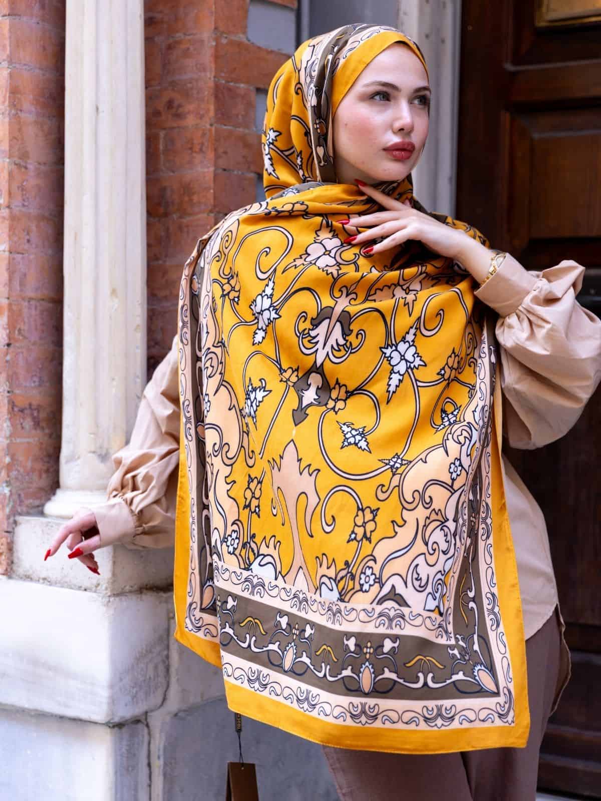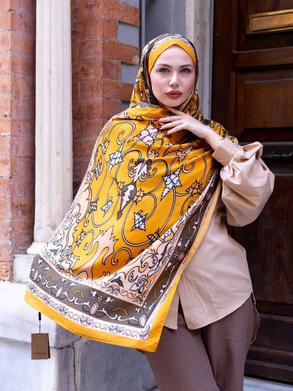 Hardal İberya Işığı Desen Pamuk İpek Şal – Touch İpek