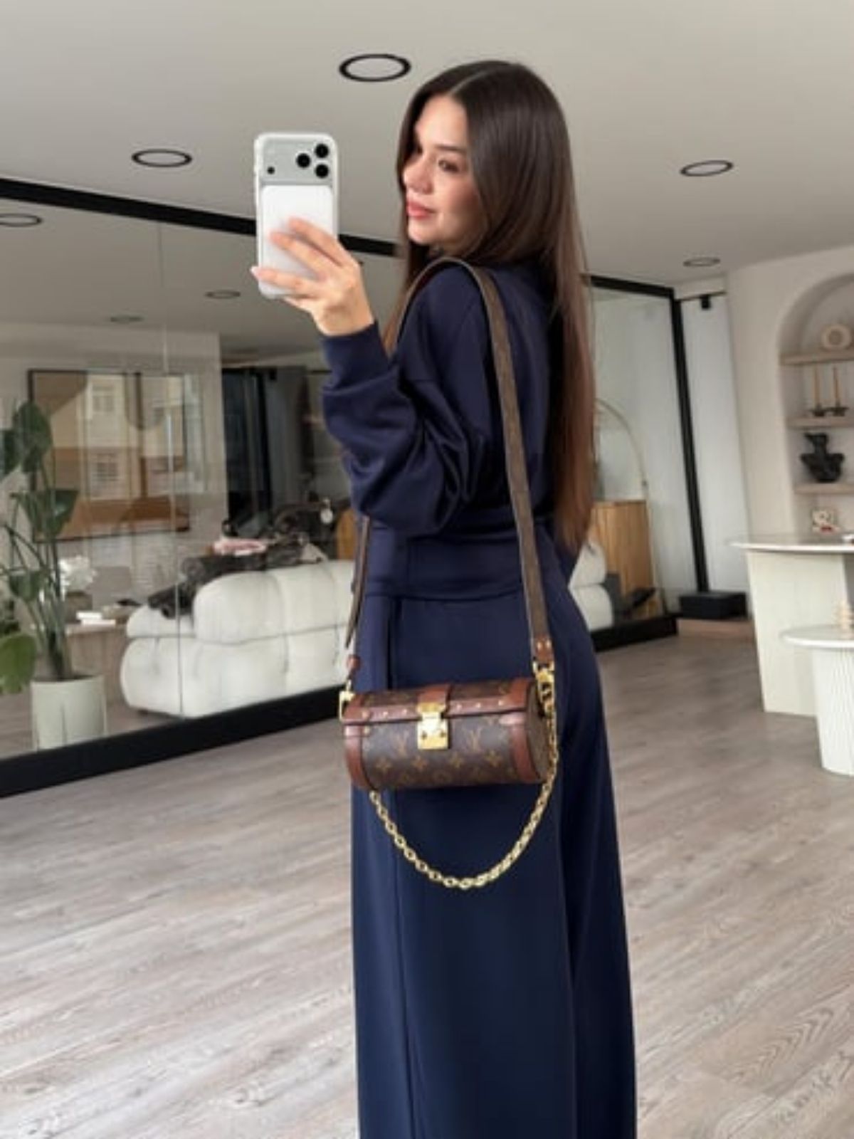 Boy / Kilo 160 cm / 48 kg Üst : Balıkçı Yaka , Uzun Kol / Alt : Cepli , Pile Detaylı , Geniş Paça