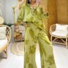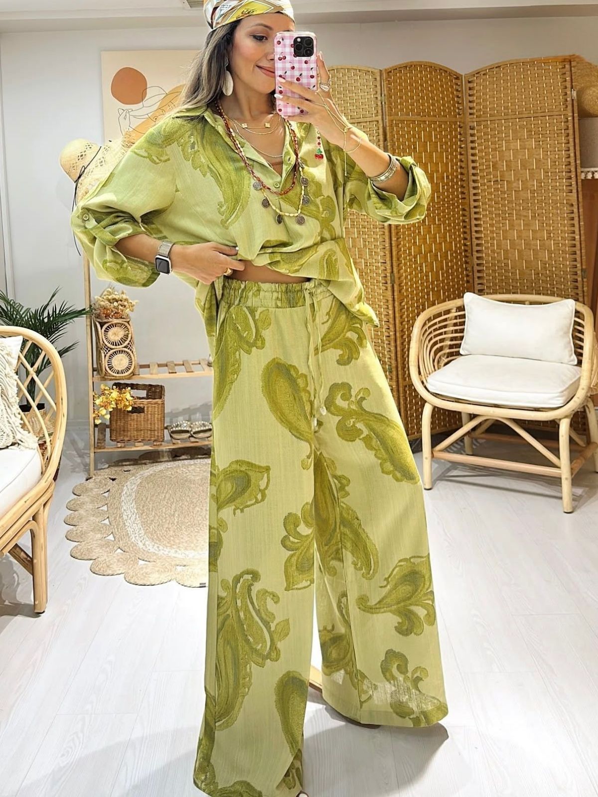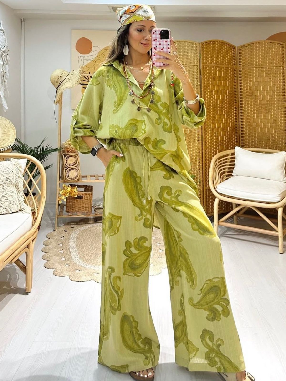 Bohem dokunuşlarla harmanlanmış modern bir duruş: Bu oversize takım, rahatlığın ve tarzın iddialı bir buluşması! Yumuşak ve hafif kumaşı sayesinde konforu gün boyu hissettirirken, geniş paçalı pantolonu ve dökümlü üstüyle özgür ve şık bir siluet sunuyor.