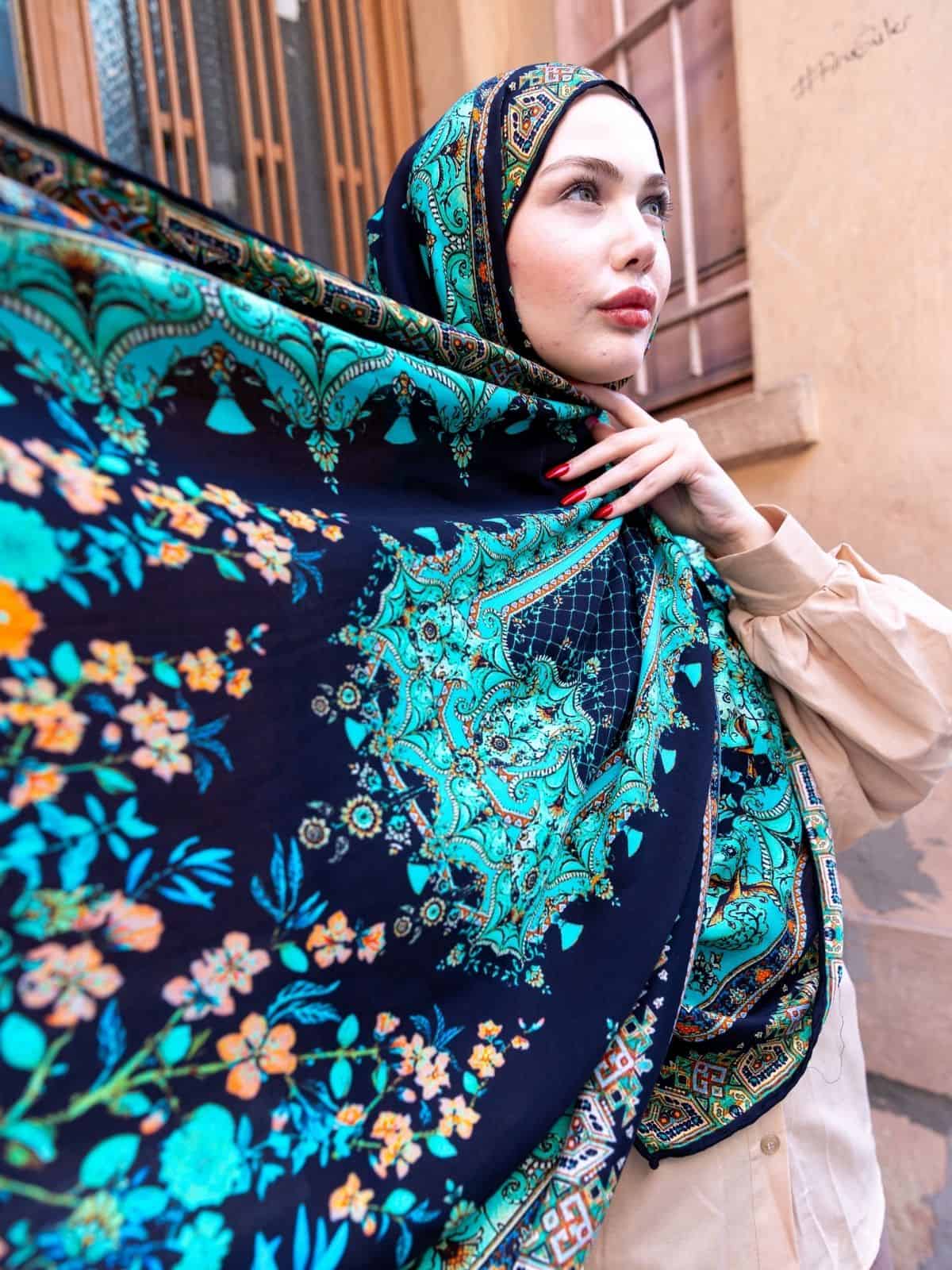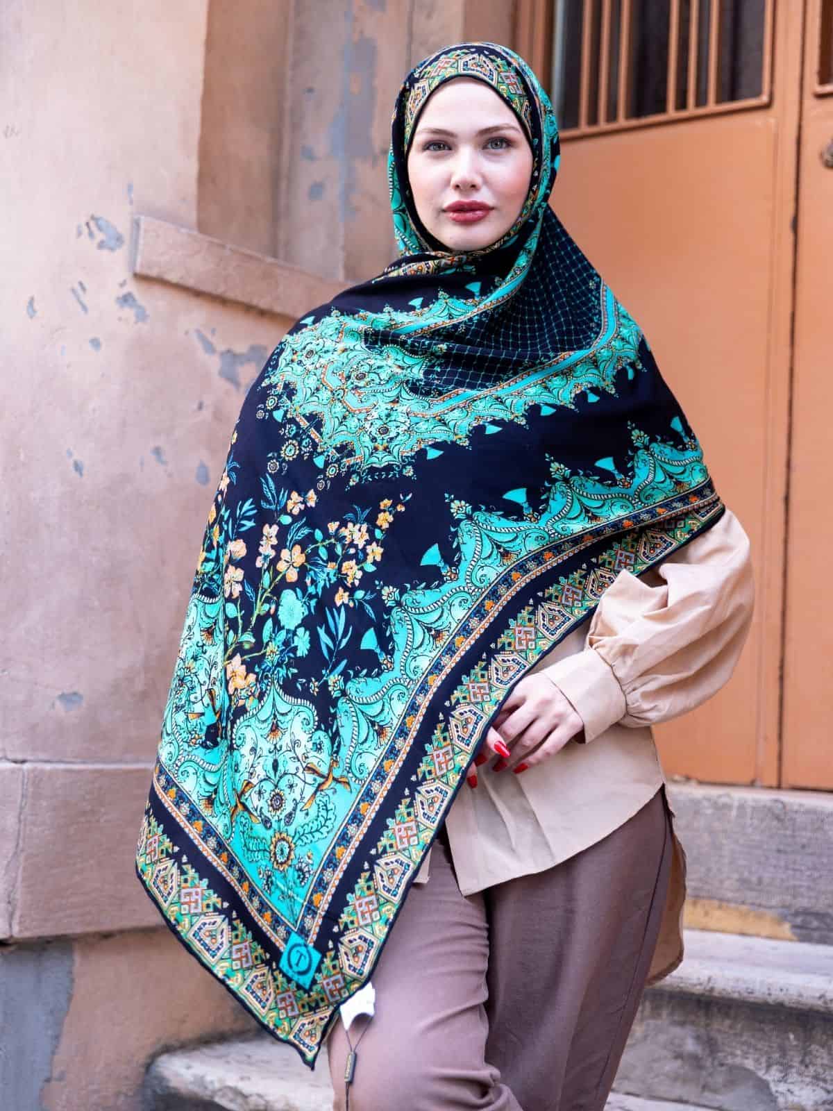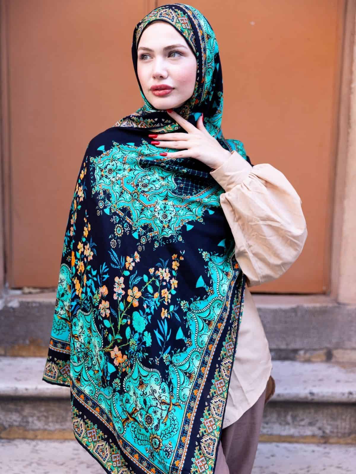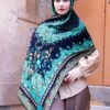 Petrol Safir Desenli Yün İpek Şal – Touch İpek