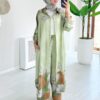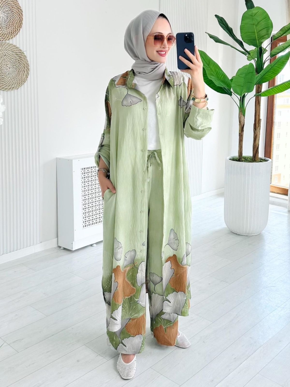 Doğanın ferah tonlarını yansıtan bu takım, rahat kesimi ve zarif deseniyle günlük ve özel davetlerde şıklığınızı tamamlar. Mint yeşili üzerine uygulanan kahverengi ve gri yaprak desenleri, modern ve huzurlu bir görünüm sunar. Hafif kumaşı sayesinde sıcak havalarda konforlu kullanım sağlar.