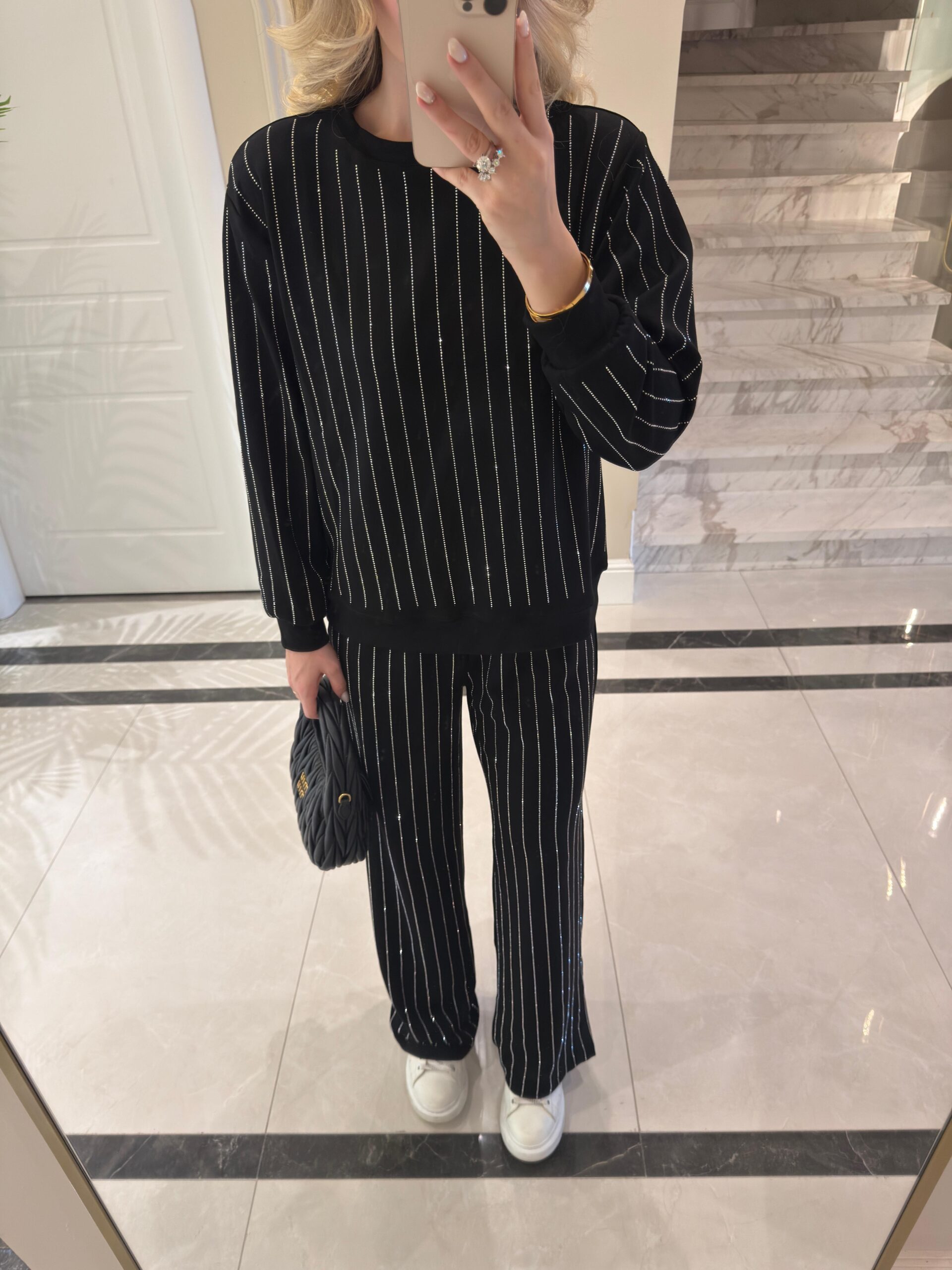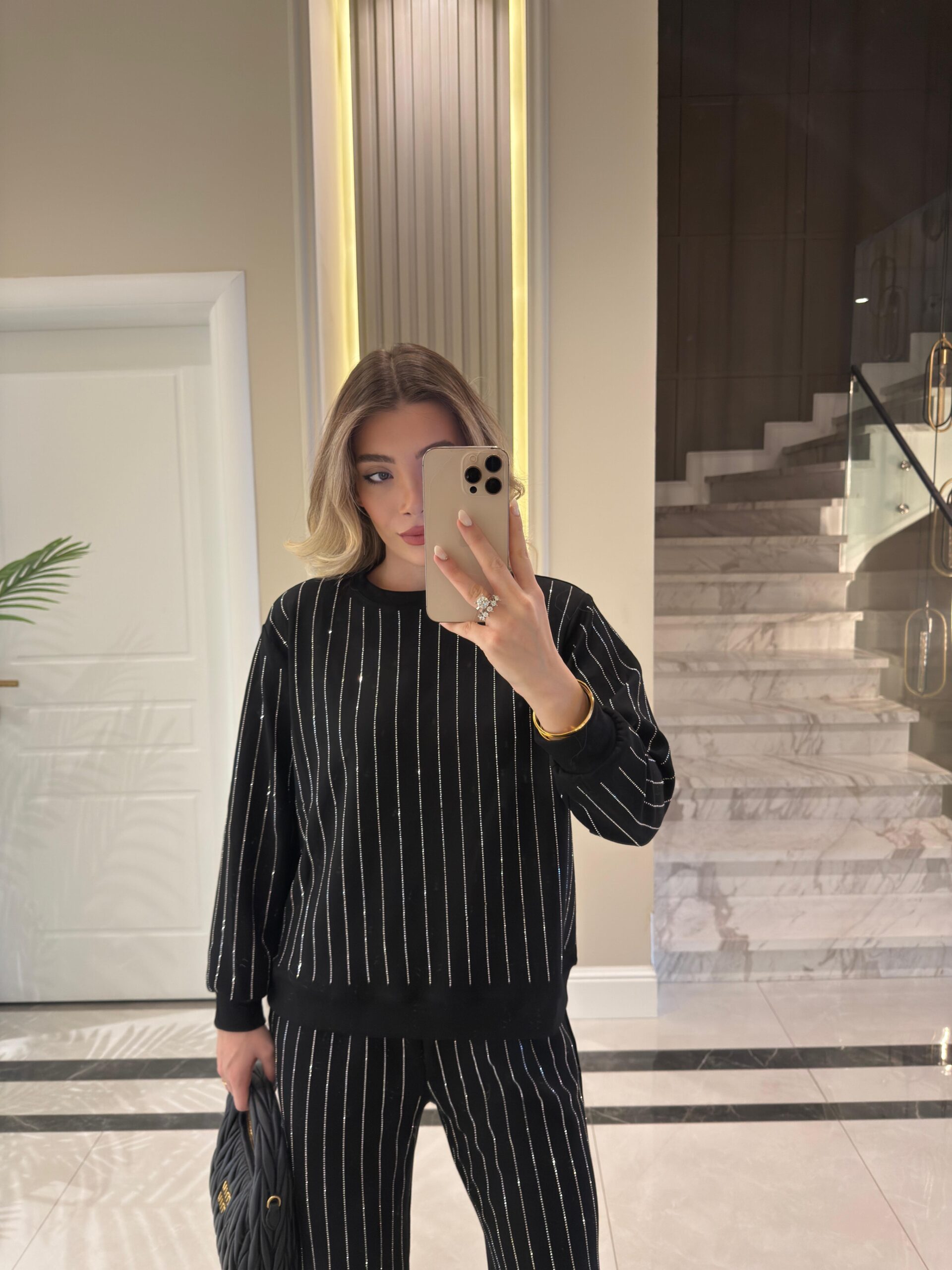 Boy / Kilo 160 cm / 48 kg Üst : Bisiklet Yaka , Taşlı / Alt : Bel Lastikli , Geniş Paça , Cepli
